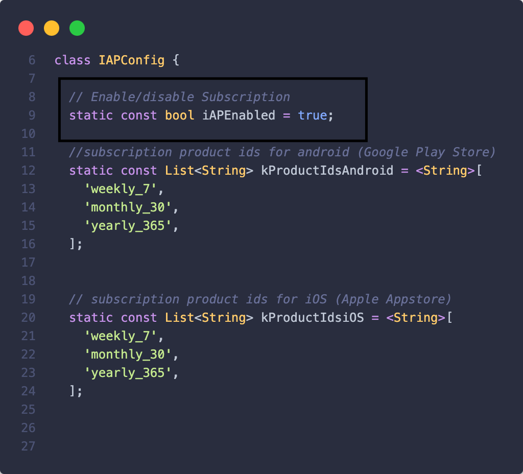 Go to the **lib/iAP/iap\_config.dart** file and add your **Product IDs** here separated with commas as shown in the picture below.